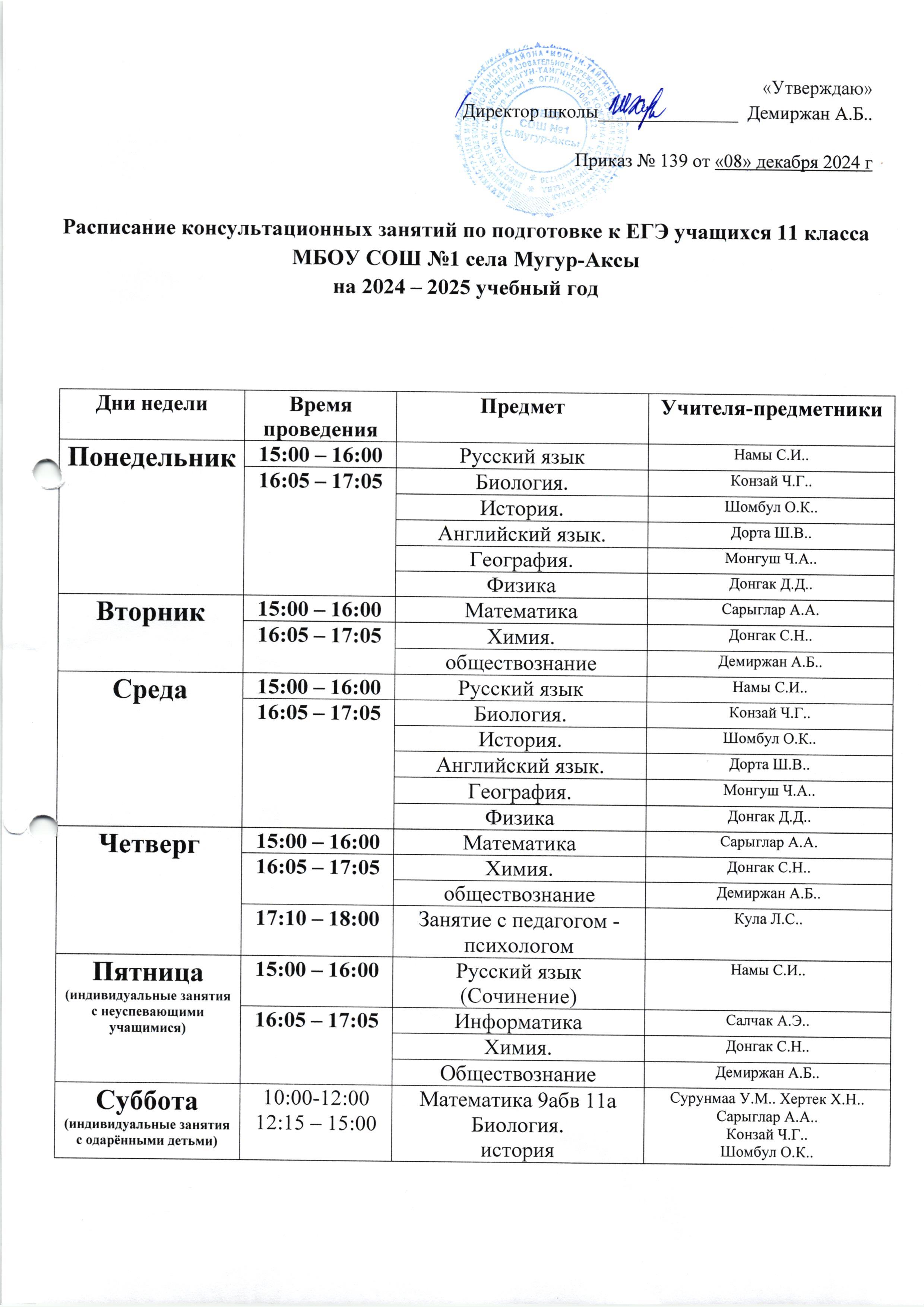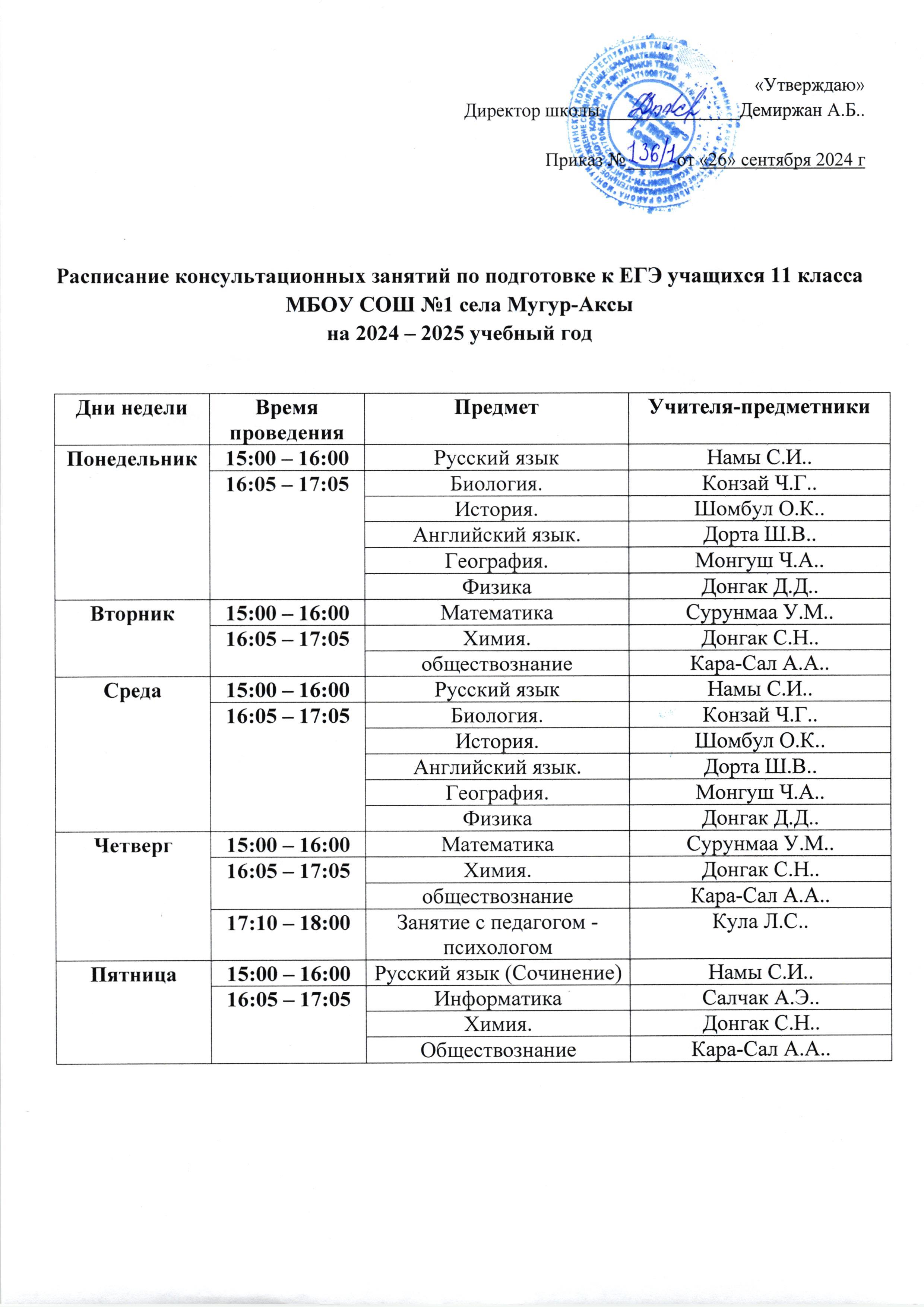 Расписание консультационных занятий по подготовке к ЕГЭ учащихся 11 класса на 2024-2025 уч. годСкачать