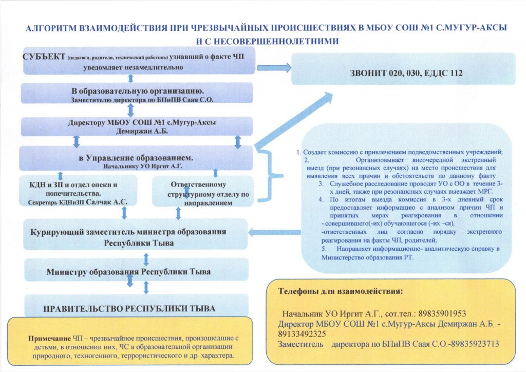 Алгоритм взаимодействия при ЧП и ЧС ПРИКАЗ №183 от 20.11.2024 Об утверждении единого алгоритма взаимодействия по фактам чрезвычайного происшествияСкачать ПРИКАЗ Минобразования Республики Тыва №183 от 19.11.2024 №1105-д Об утверждении единого алгоритма взаимодействия по фактам ЧПСкачать
